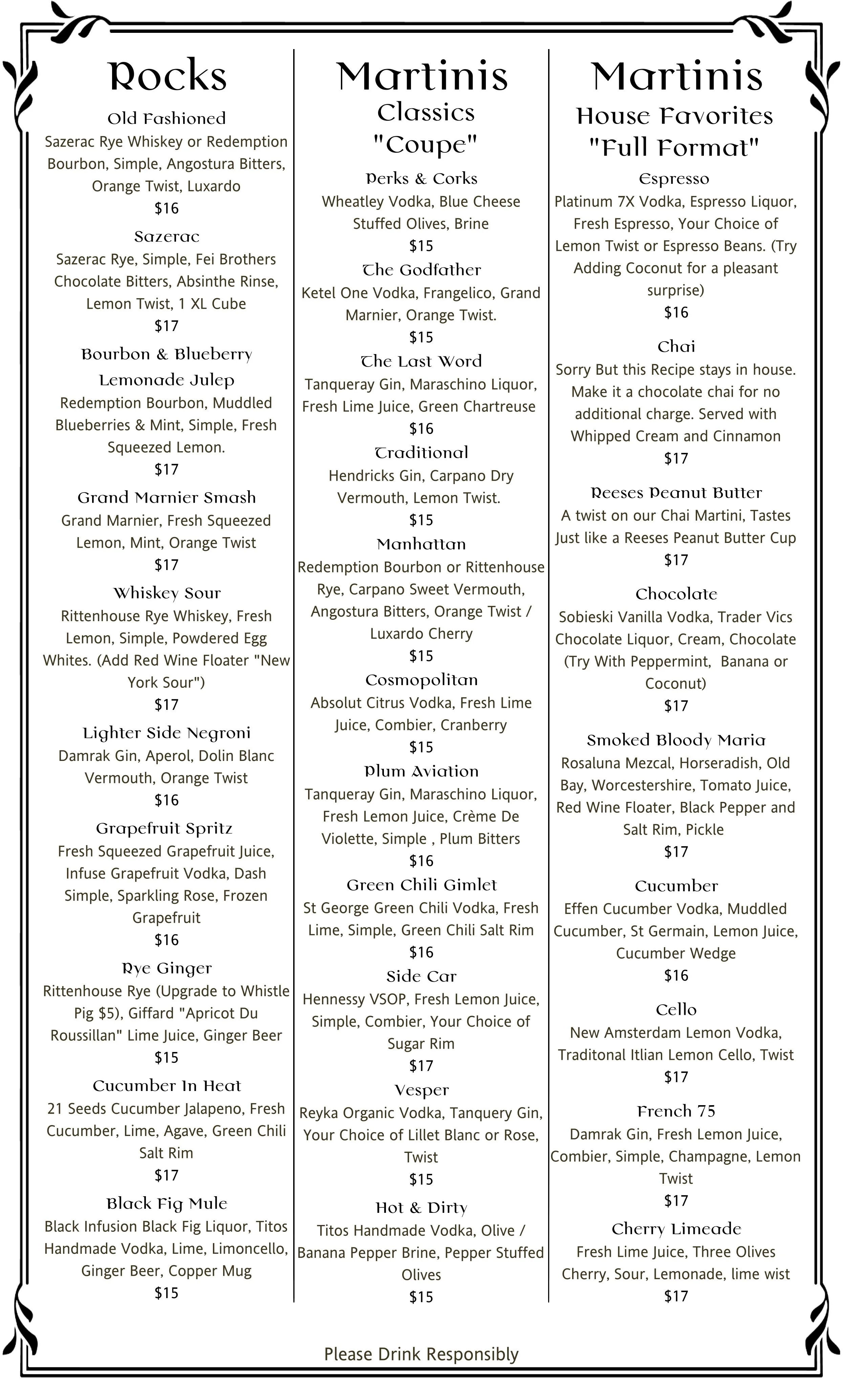 Perks & Corks Cocktail List